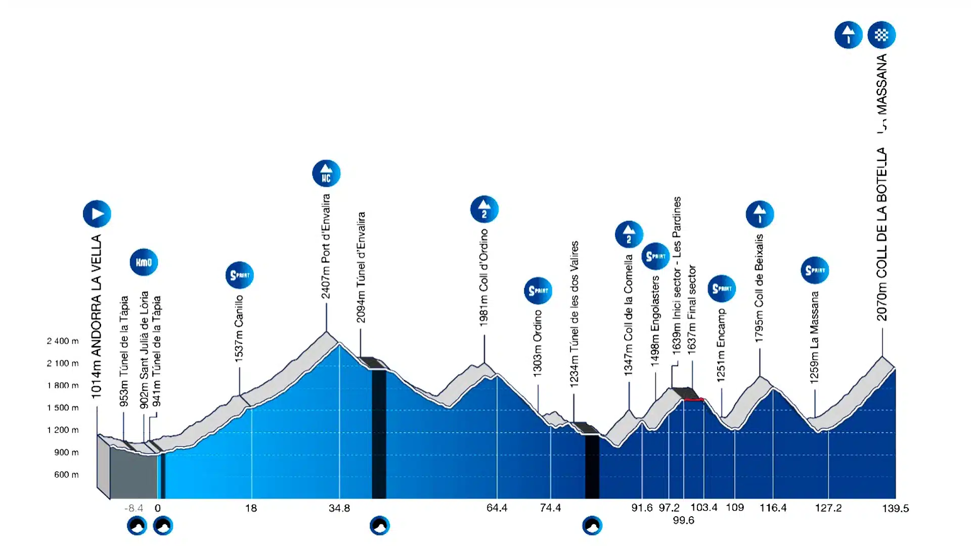 La salida tendrá lugar en Andorra la Vella (1.014 m), con una primera bajada que atraviesa el Túnel de la Tàpia y llega hasta Sant Julià de Lòria (902 m). A partir de ahí arranca la primera gran ascensión del día: el Port d’Envalira, techo de la jornada y uno de los colosos más emblemáticos del país, con una altitud de 2.407 metros tras superar Canillo (1.537 m). Coronado el puerto, los ciclistas descenderán hacia el Túnel d’Envalira (2.094 m).