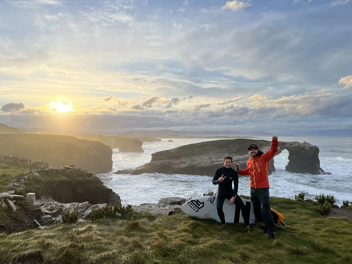 Tras superar su primer tramo destaco que “tenía que empezar en Galicia, y quería hacerlo de la forma más heavy posible, con un reto jamás hecho, cruzar surfeando los arcos de la playa de las catedrales. He de reconocer que me acojoné, no sabéis lo que impone estar ahí con ese movimiento de mar y que sí, me hizo falta el casco”.