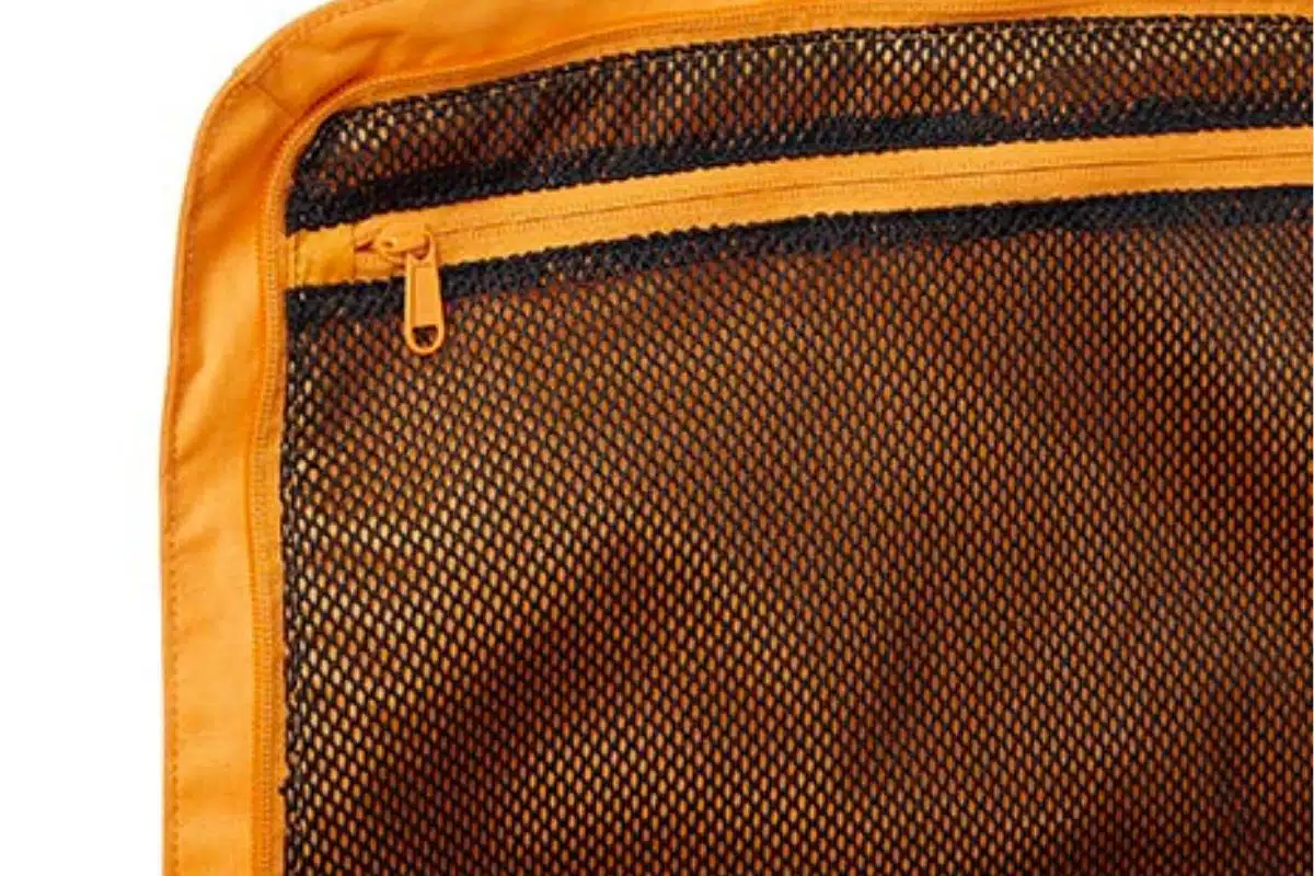 En el exterior, dispone de un bolsillo revestido con cremallera ideal para aquellos objetos que necesitas tener siempre a mano. Por dentro, incorpora dos bolsillos adicionales, uno de malla para organización y otro destinado a autoalmacenaje cuando el bolso no esté en uso, permitiendo plegarlo y guardarlo sin ocupar espacio.