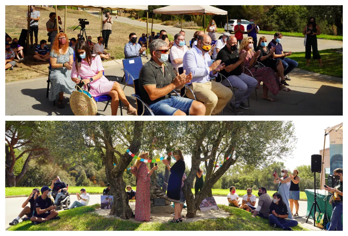 Merced Llauradó, y Miriam Roset junto dos jovenes de la entidad APINDEP junto al monolito de piedras en memória de Sergi Mingote. (Copyright/ OF)