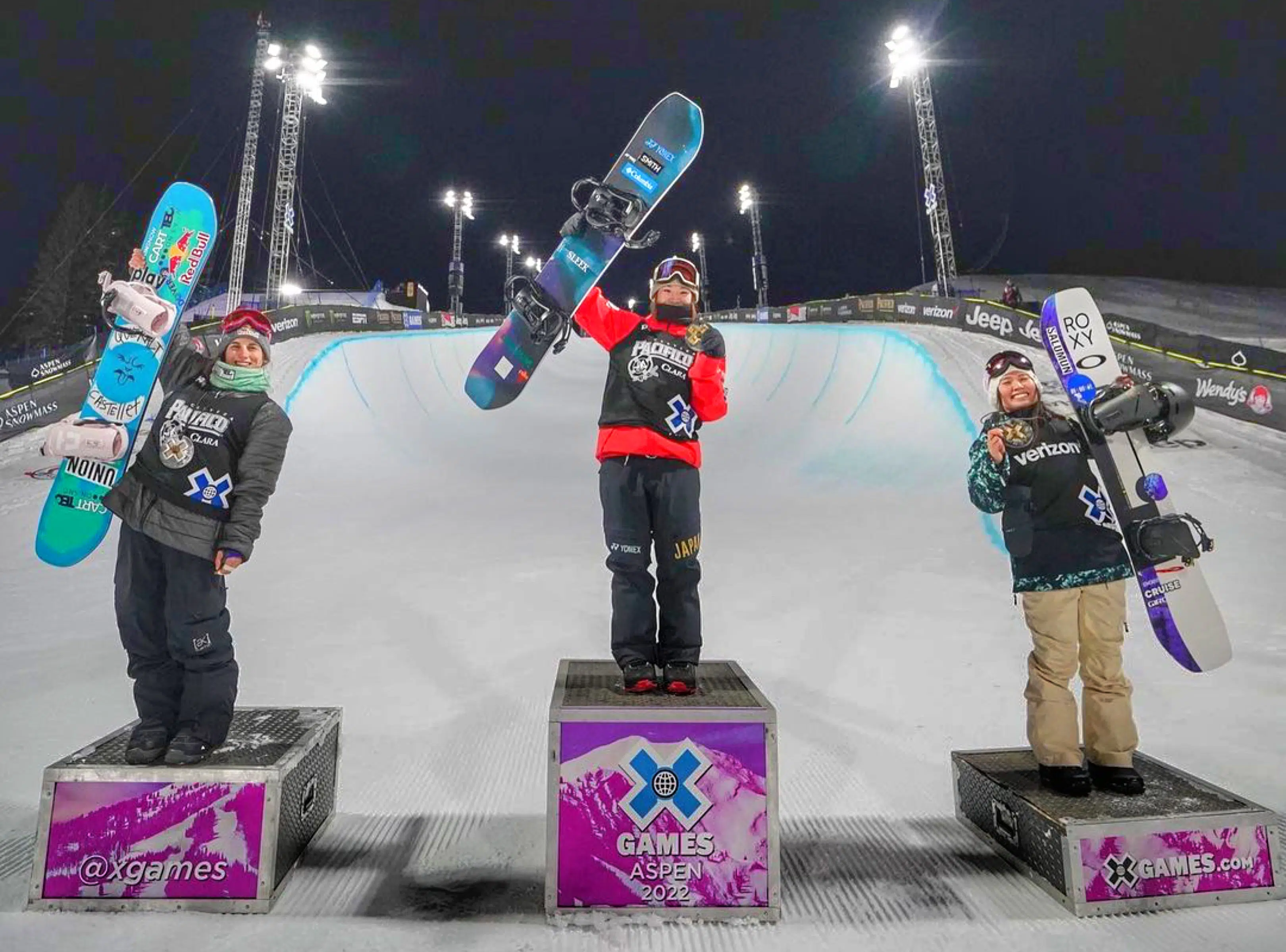 Queralt Castellet, Sena Tomita y Haruna Matsumoto compartieron el podio de la modalidad de superpipe de los X Games de Aspen 2022. (izq a der.)