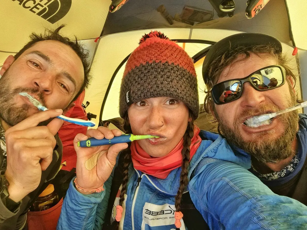 Stefi Troguet Domi Trastoy Moeses Fiamoncini irradian optimismo desde su tienda ubicada en el C2 del Dhaulagiri.