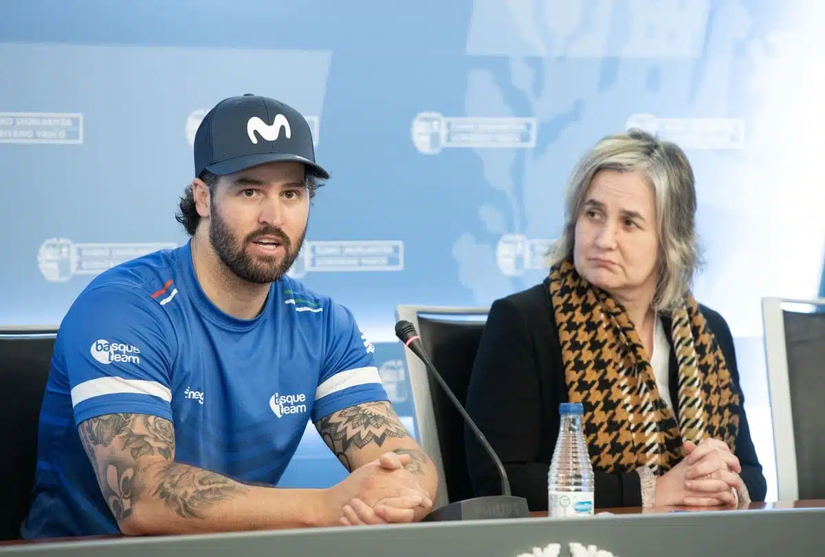 Lucas Eguibar comparecido en rueda de prensa en la sede del Gobierno Vasco de Donostia, acompañado de Olatz Legarza, coordinadora de la Fundación Basque Team, tras regresar a casa desde