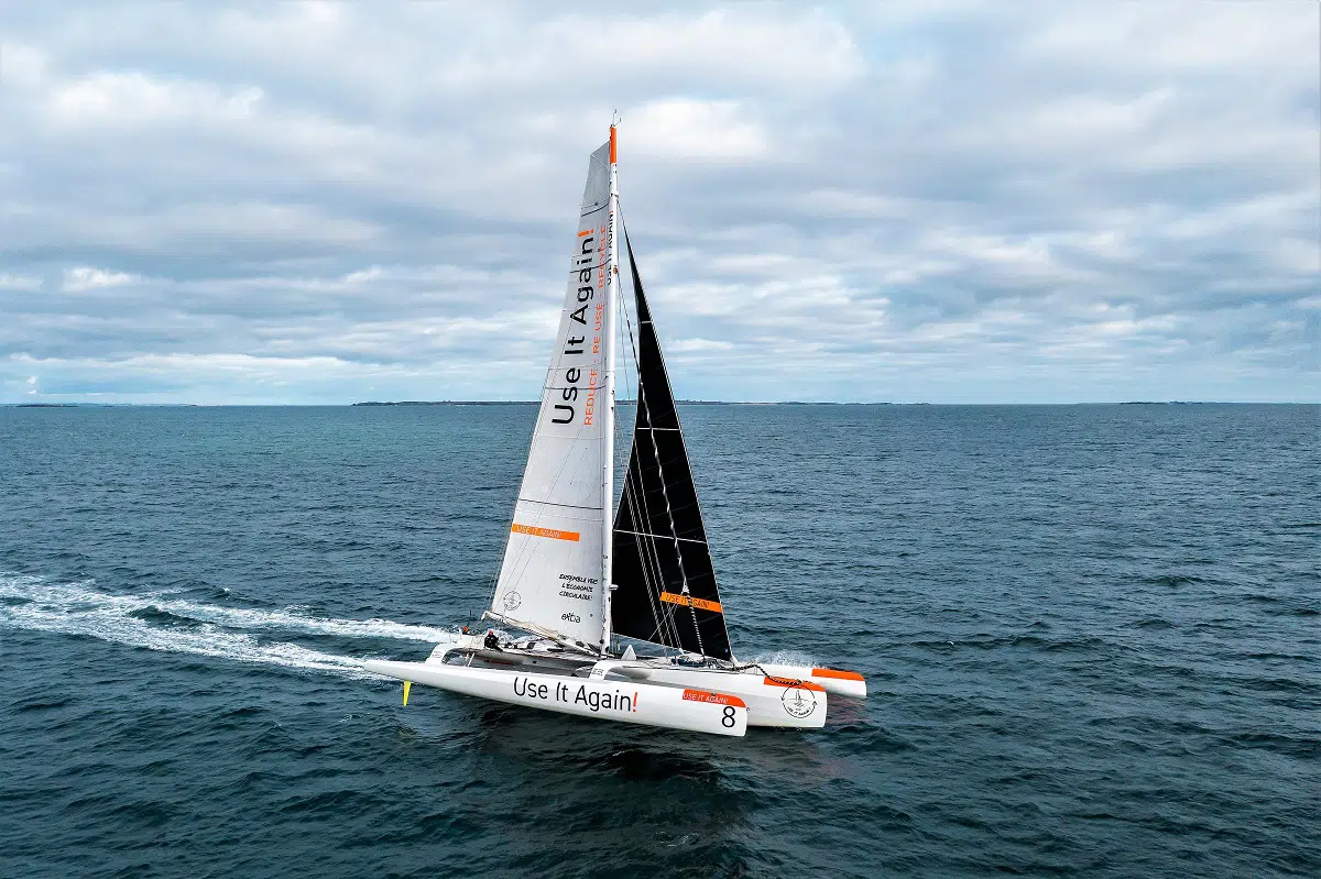 El reto lo realizan a bordo de un maxi-trimarán con mucha história y construido en 2003 para Ellen Mac Arthur. En 2016, el equipo de “Use It Again!” compró el trimaran en estado de abandono y lo renovó completamente. El objetivo era rescatar el trimarán y reducir al mínimo el impacto de su reparación en el medio ambiente, de acuerdo con los principios de la economía circular: Reducir – Reutilizar – Reciclar. El trimarán quiere convertirse en un ejemplo, para la promoción de la economía circular.