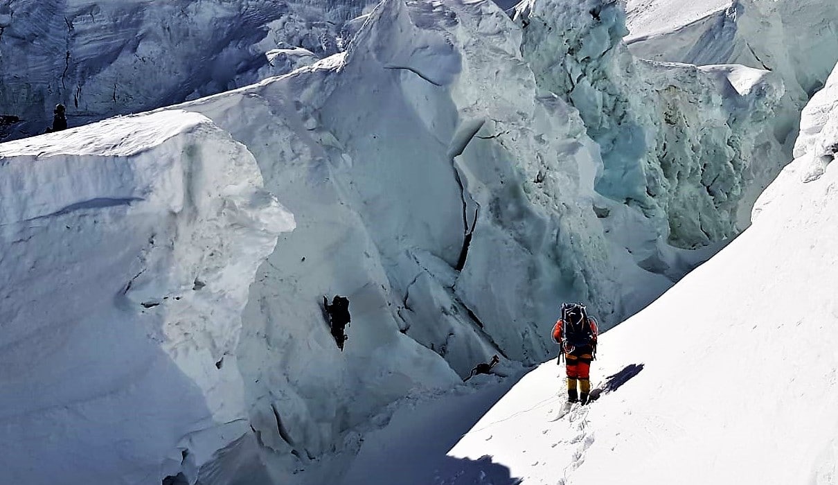 Simone Moro hizo en solitario la cuarta rotación entre el campo base y los 6.550 metros para llevar una tienda de campaña y 400 metros de cuerda. Lo hizo en siete horas, entre ascenso y descenso.