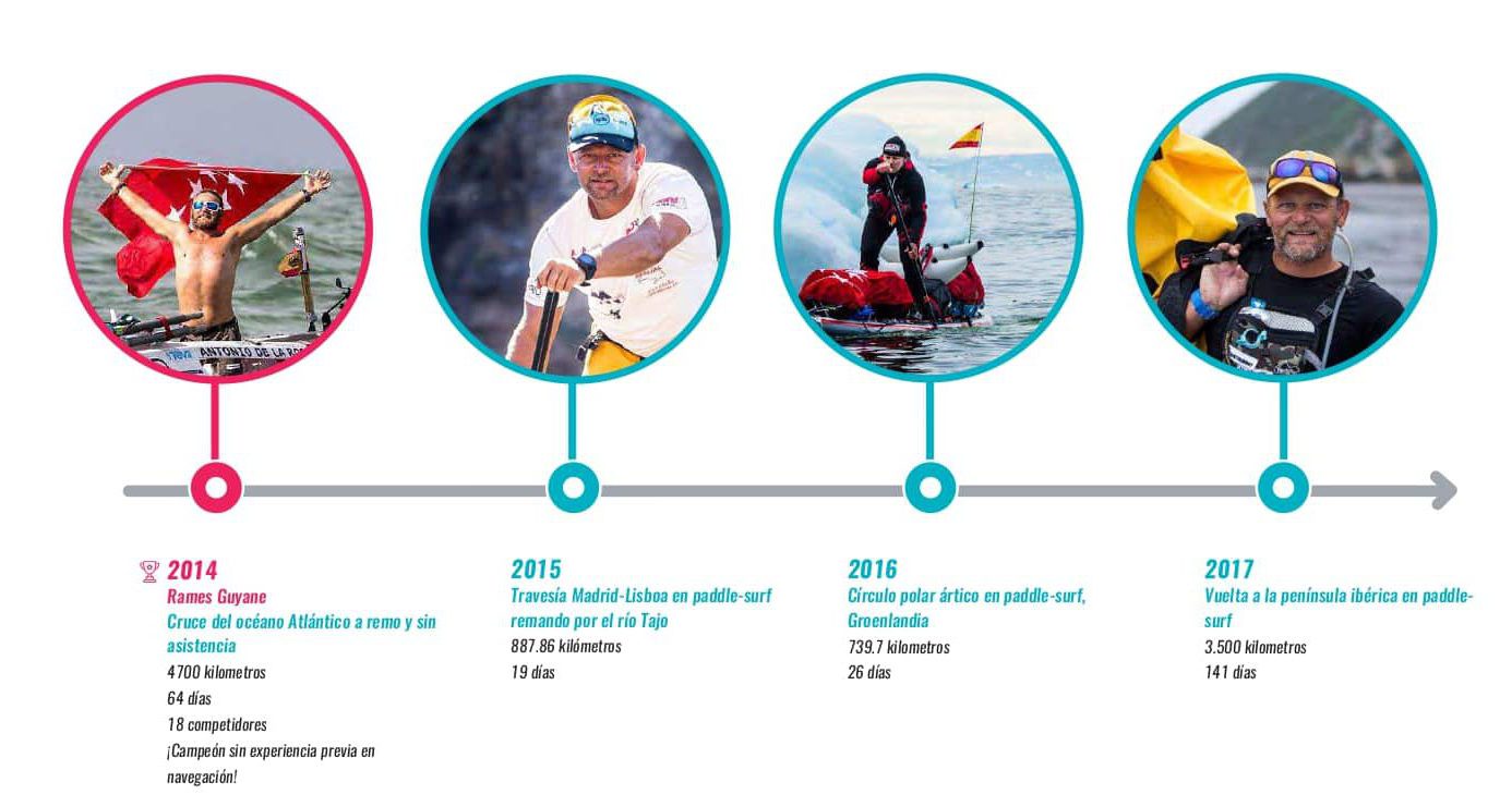 Antonio de la Rosa (Valladolid, 1969) ya ha iniciado la cuenta atrás para preparar su nueva aventura extrema. Quiere convertirse en la primera persona en cruzar el océano Pacífico en solitario a bordo de una embarcación de SUP, remando de pie y en solitario los 5.000 km que le llevarán de Sausalito, en la bahía de San Francisco, a Honolulu en Hawái. En su curriculum hay innumerable retos deportivos y humanos como cruzar a remo el océano Atlántico en 2014 o completar la vuelta a la Península Ibérica navegando en paddle surf. Su último reto le llevo el invierno pasado a la Laponia para participar en la Lapland Extreme Challenge (1.000 kms), que pudo completar con récord incluido en su segundo intento.
