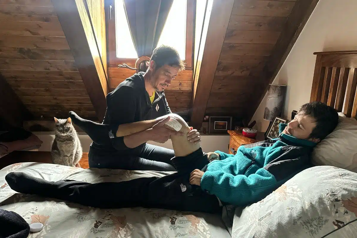Sesiones de recuperación en casa. Aymar Navarro trabaja la movilidad de su rodilla bajo la supervisión del fisioterapeuta, Jordi Esparó, en su casa de la Val d’Aran. (Copyrigh/Team Aymar)