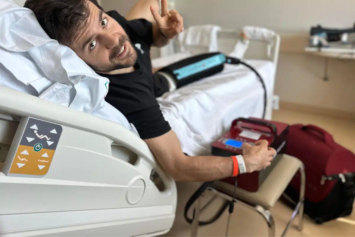– Ahora me centro en ir ganando grados de flexión con la máquina Kinetec. Paso muchas horas al día con ella, intentando doblar un poco más cada jornada, según lo que me marcan el doctor y los fisios. Después, presoterapia, frío… porque se inflama mucho. Hay que tener en cuenta que tengo tres lesiones diferentes: meniscos, tendón rotuliano y ligamentos. Cada una requiere un tratamiento distinto. Una necesita inmovilización, otra movimiento. Es como un rompecabezas: tienes que ir ajustando según sensaciones, sin forzar, sin querer correr. Todo paso a paso, escuchando al cuerpo.