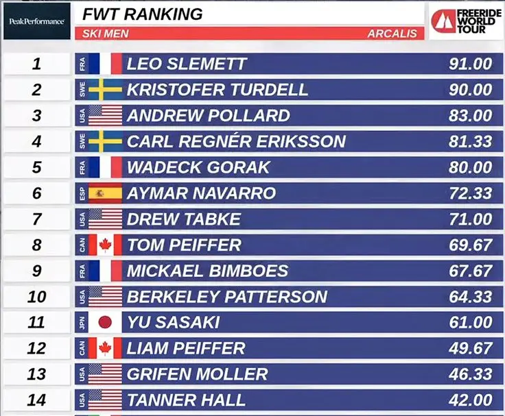 La prueba de Ordino-Arcalis, que cerraba el circuito regular después de cuatro competiciones, ha sido ganada por el francés Leo Slemett que se ha situado tercero en la general gracias a los 2.500 puntos sumados. El actual líder de la competición, el italiano Markus Eder no ha tenido el día y ha acabado en una discreta decimoquinta posición. Eder, subcampeón la temporada pasada no ha podido sentenciar el campeonato. En Verbier, Markus Eder -7.200 ptos- el sueco Kristofer Turdell -5.800 ptos- y vigente campeón del FWT, junto con el francés Leo Slemett -5.180 ptos- y el norteamericano Andrew Pollard -5060 ptos- se disputaran el podio del Freeride World Tour 2019. Si Eder no “pincha” como en Ordino-Arcalis lo tiene todo de cara para ganar su primer Campeonato del FWT.