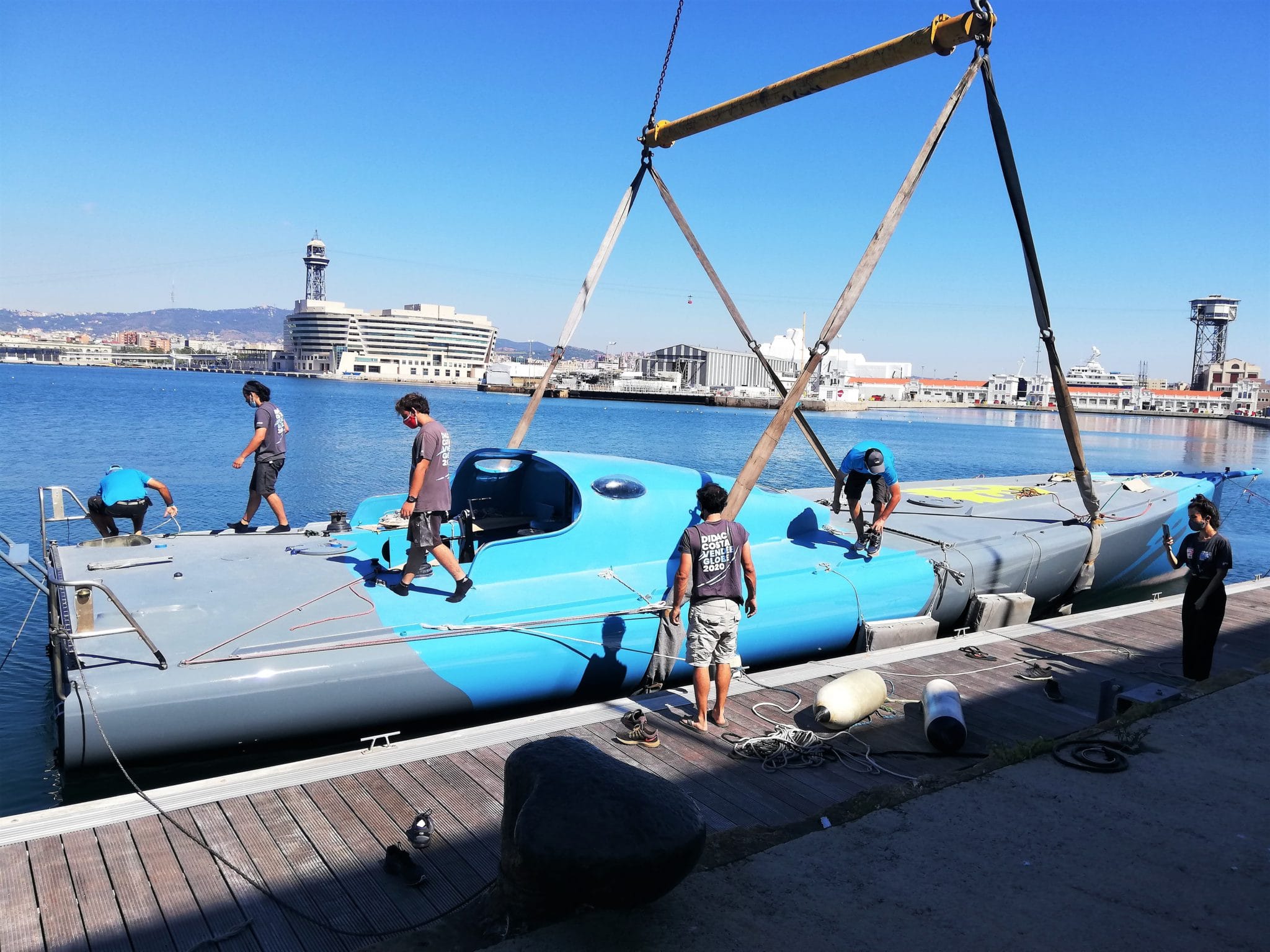 La botadura del nuevo «One Plane One Ocean», en el astillero de la Fundación para la Navegación Oceánica de Barcelona, fue un acto sin pompa, pero cargado de sentimiento e ilusión. El pequeño equipo que arropa al navegante oceánico Dídac Costa disfrutó del momento más agradecido de los últimos siete meses. Fue impagable ver la cara de satisfacción de Dídac Costa. Su sonrisa de oreja a oreja sólo irradiaba felicidad. Su joven equipo de ayudantes, liderado por el curtido Pep Costa en funciones de team manager, también estaba exultante. Se ponía fin al trabajo más ingrato y duro que desde enero llevó a cabo su equipo de incondicionales con la pandemia del coronavirus de por medio.