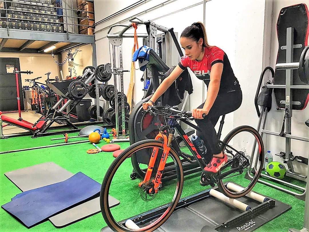 Rocío García entrenando estos días de cuarentena en el amplio gimnasio que dispone el equipo BH Templo Cafés. (Copyright/@kalavera_kalabike)