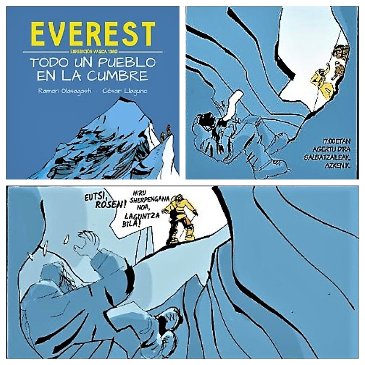 Ahora la historia de la exitosa expedición de 1980 y la del 1974 se ha plasmado en formato de cómic -‘Everest: todo un pueblo en la cumbre’-, gracias a la colaboración del Bilbao Mendi Film Festival y la Editorial SUA. El dibujante César Llaguno rememora la histórica ascensión con sus dibujos, dando vida al guion adaptado por Ramón Olasagasti.