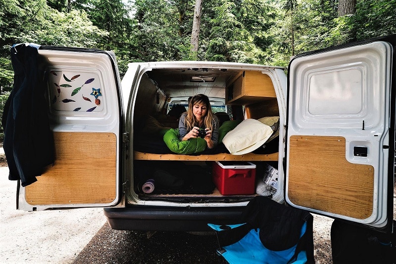 La escaladora Colette McInerney, embajadora de la marca Sea-to-Summit, dentro de su furgoneta customizada.