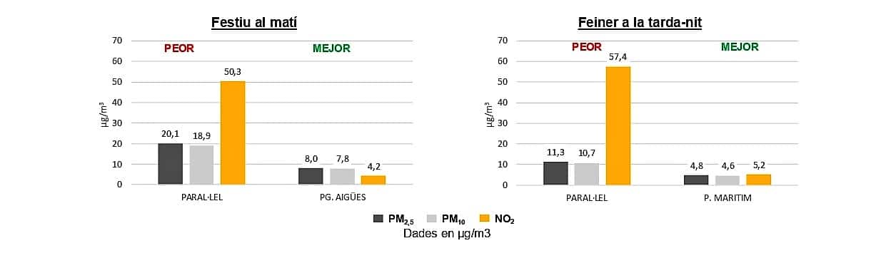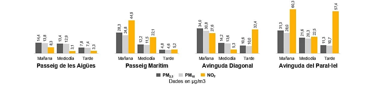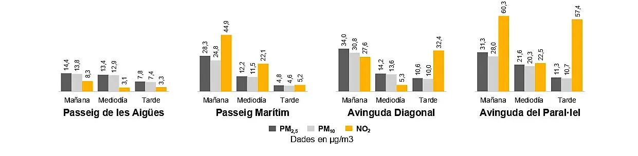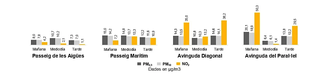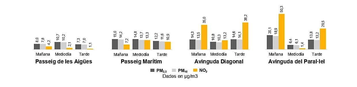 • Los resultados indican que, a una misma hora, las diferencias entre el mejor y el peor lugar son significativas: por ejemplo, un laborable por la tarde, la mejor ubicación (Passeig Marítim) tiene hasta 10 veces menos dióxido de nitrógeno (NO2 ) y la mitad de partículas en suspensión (PM) que la peor ubicación (Av. del Paral·lel).