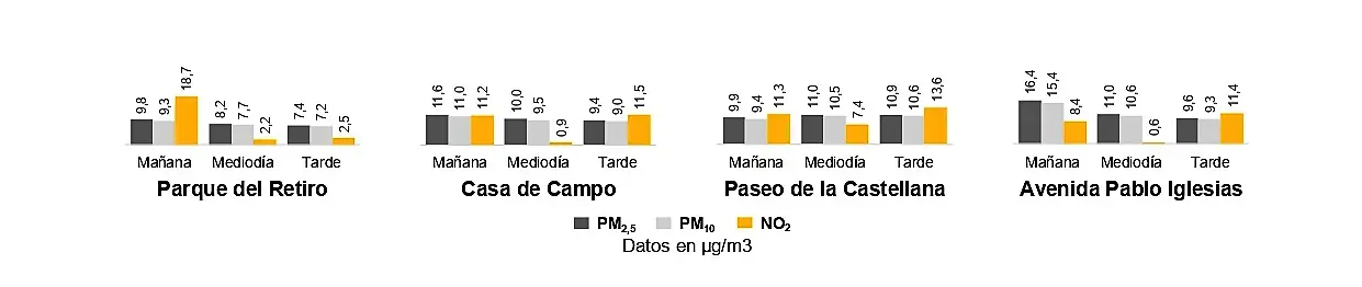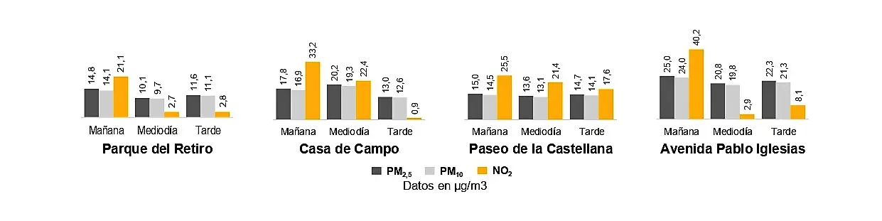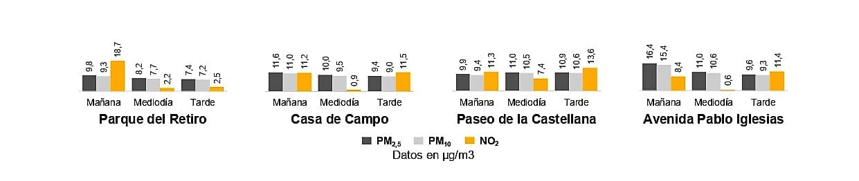 • En general, es preferible evitar los entrenamientos durante la mañana (entre las 7 y las 11 h), ya que el nivel de contaminación es el más alto del día en todas las ubicaciones analizadas.