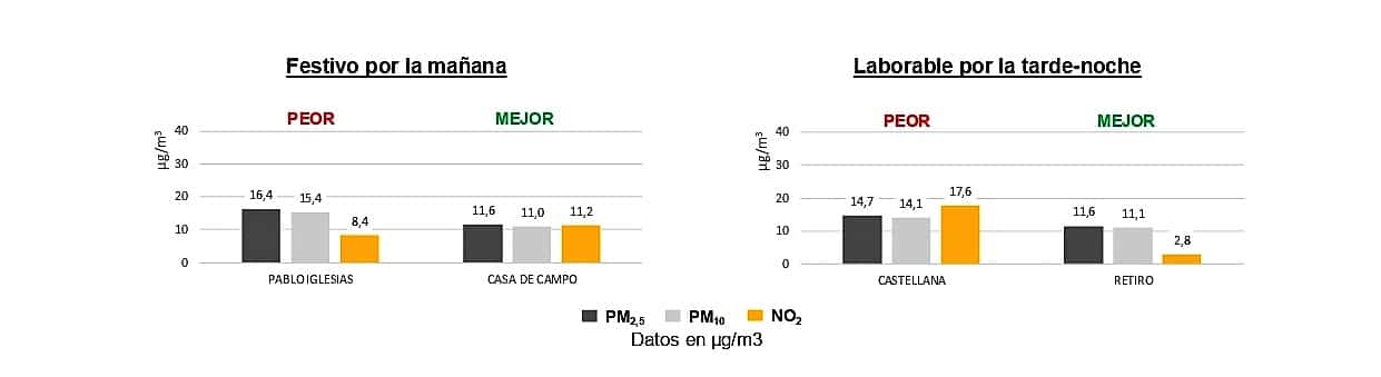 • En días laborables, el itinerario más aconsejable para runners es el Parque del Retiro, y el menos recomendable es la Av. Pablo Iglesias, donde destaca la presencia de NO2 debido al tráfico.