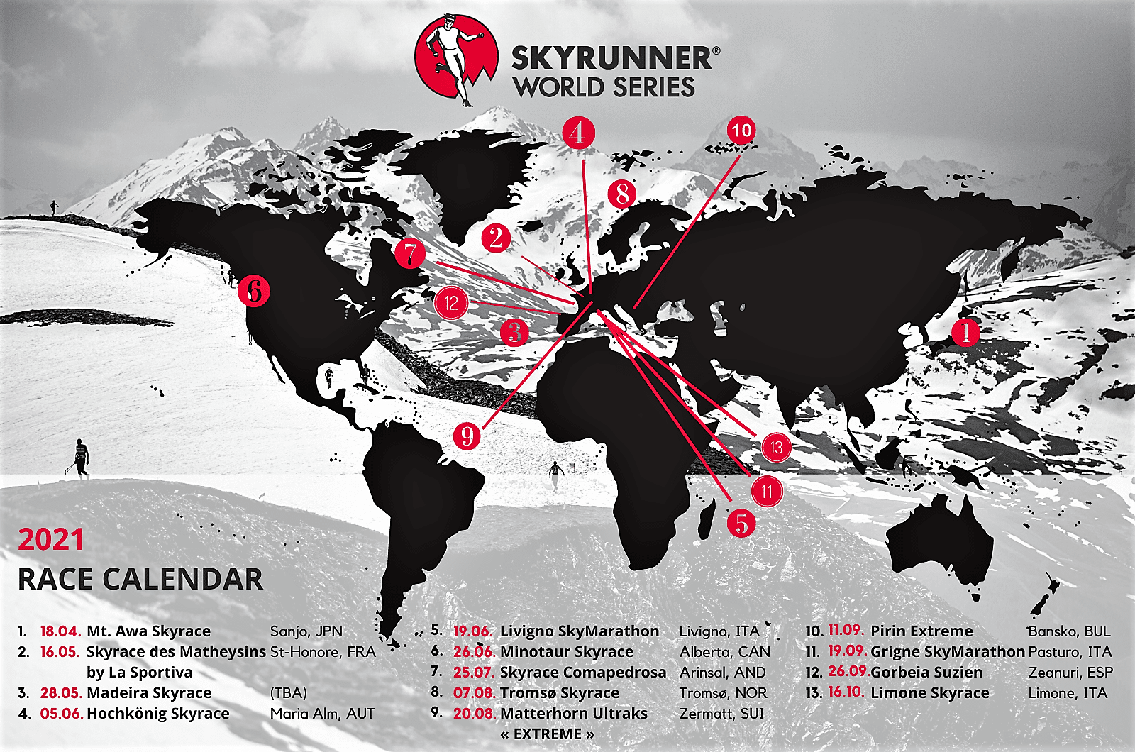 La Skyrunner World Series, también conocida como la Copa del Mundo de skyrunning, hizo público el calendario de carreras para el año 2021. En total son 13 carreras en todo el planeta. En la península ibérica se disputan sólo dos pruebas: Skyrace Comapedrosa (Andorra) -25 de julio- y la Gorbeia Suzien -26 setiembre- en Zeanuri (Vizcaya). A nivel español, con respecto al calendario de 2020 desaparece la prueba de la Transvulcania. El circuito comenzará el 18 de abril con la Mt Awa Skyrace en Japón y finalizará el 16 de noviembre con la Limone Skyrace Extreme en Italia.