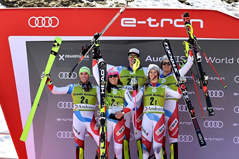 El equipo de Suiza ha ganado la prueba del Alpine Team Event disputada en el tramo final de la pista Àliga del sector de El Tarter de Grandvalira. Era la última prueba de las finales de la Copa del Mundo de esquí alpino en esta zona antes de trasladar la competición a la selectiva pista Avet de Soldeu para la disputa de las pruebas técnicas. Como en las dos jornadas anteriores las gradas presentaban un lleno «hasta la bandera».