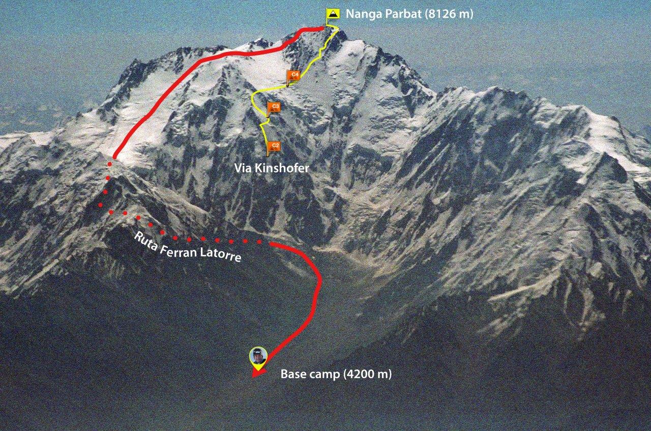 La expedición tiene previsto atacar la cumbre del Nanga Parbat por una nueva ruta de la vertiente norte del Diamir (ver línea roja de la fotografía) a mediados de julio. Han intentado esta ruta varios alpinistas, como Reinhold Messner y Simone Moro, pero hasta ahora nunca nadie ha conseguido finalizar con éxito. El recorrido de la expedición comparte la cara norte del Diamir con la ruta más normal y utilizada en la ascensión al Nanga Parbat: la vía Kinshofer (línea amarilla en la imagen). Para agilizar la ascensión por el largo recorrido de la misma, la expedición hará el tramo del glaciar Diama con esquís.