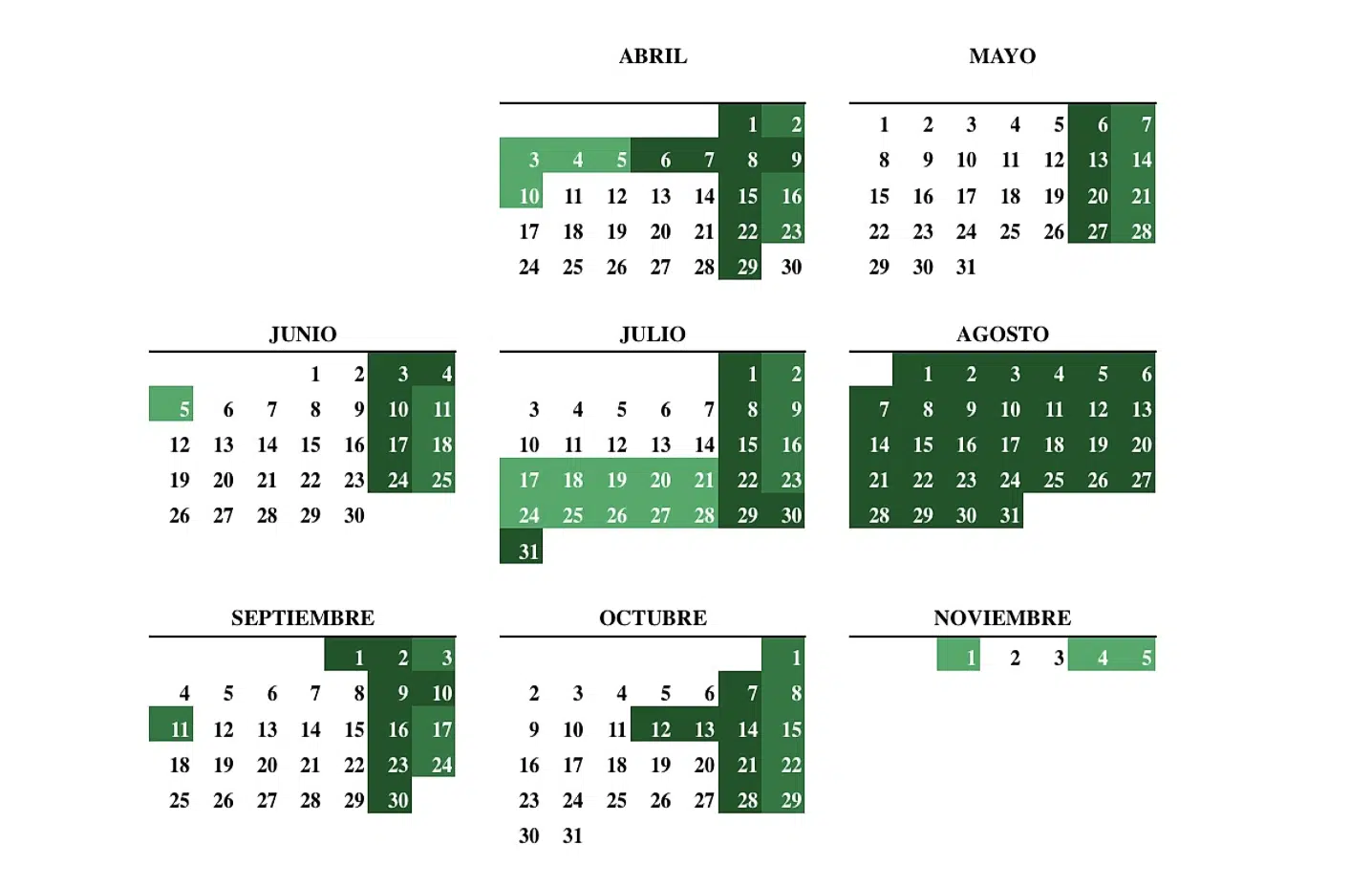 Temporada Baja (de 10.30 ha 15.45 h): 3, 4, 5 y 10 de abril, 5 de junio, del 17 al 21 de agosto y del 24 al 28 de agosto, 1, 4 y 5 de noviembre.