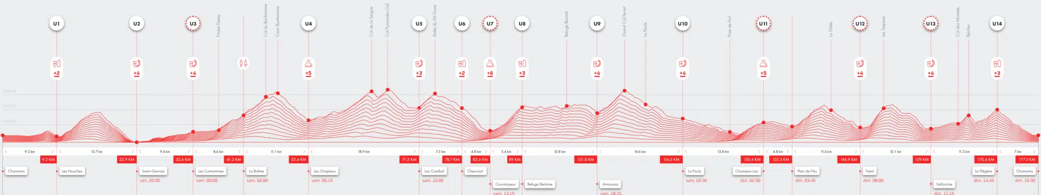 | Lunes 25 agosto | PTL | 300 km | 25.000 m+ | Chamonix | 08:00 | 151 h |
