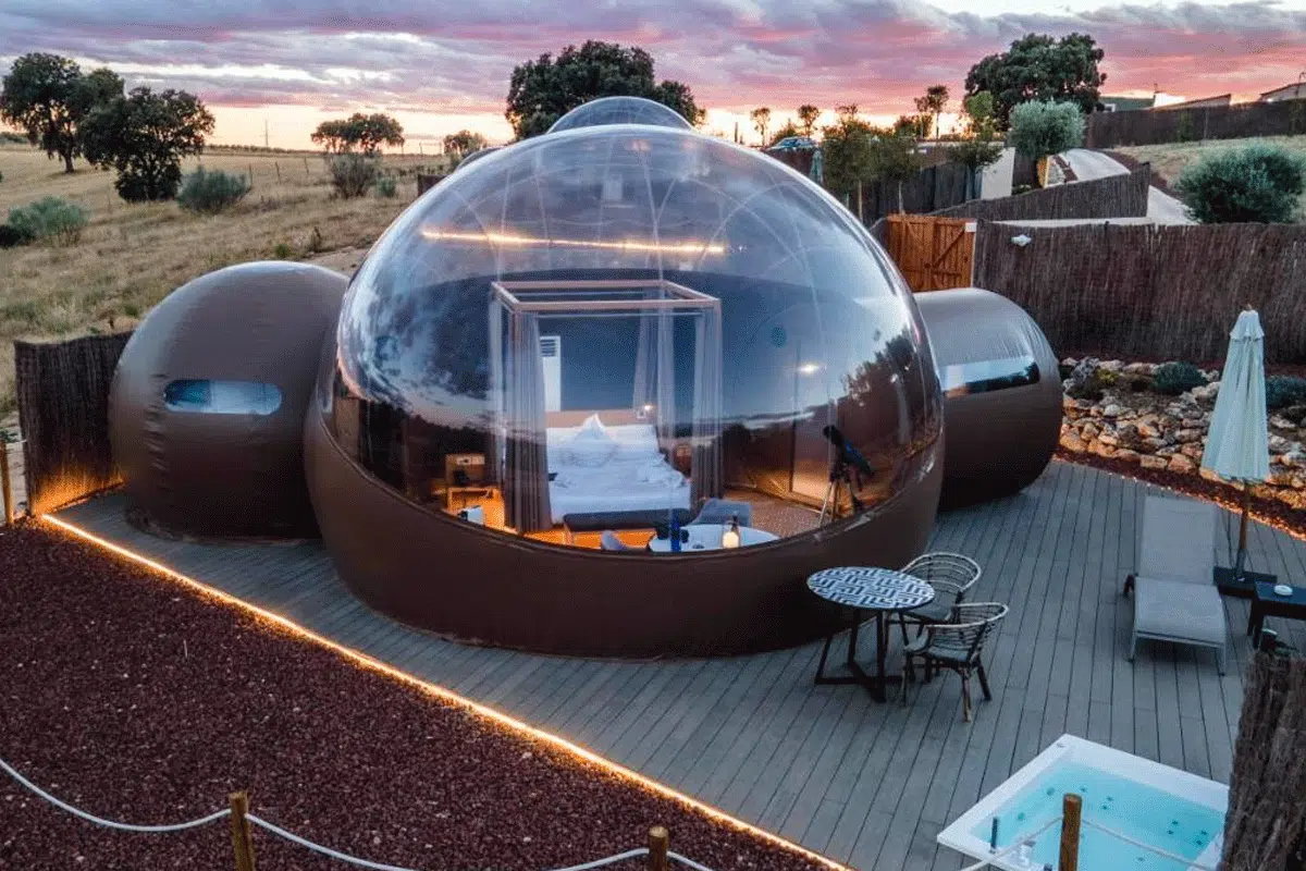 Una opción 100% ecológica que busca adaptarse totalmente al entorno, suelen tener la parte delantera y trasera de cristal para disfrutar de vistas directas del entorno durante la noche.
