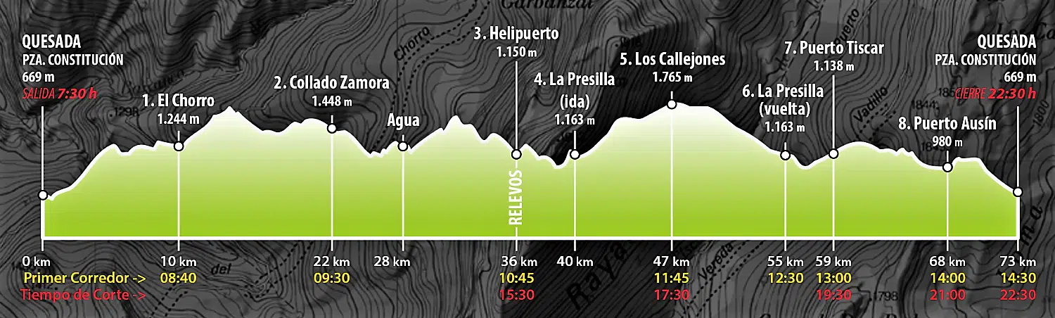 En el penúltimo avituallamiento situado en Puerto Tiscar (1.138m) situado en el km 59, Jesús Gil -5h24’47»- lideraba la prueba, pero seguido a poco menos de tres minutos por José Ángel Férnandez “Canales”. Miguel Caballero fue el tercero en pasar, pero a casi cinco minutos del líder. A partir de aquí venían los catorce kilómetros decisivos que eran un auténtico rompe piernas, tras más de cinco horas y media corriendo. Se alternaban bajadas técnicas con subidas exigentes, como el último Cerro de La Magdalena, para posteriormente realizar un cresteo y afrontar la bajada técnica hasta la localidad de Quesada.