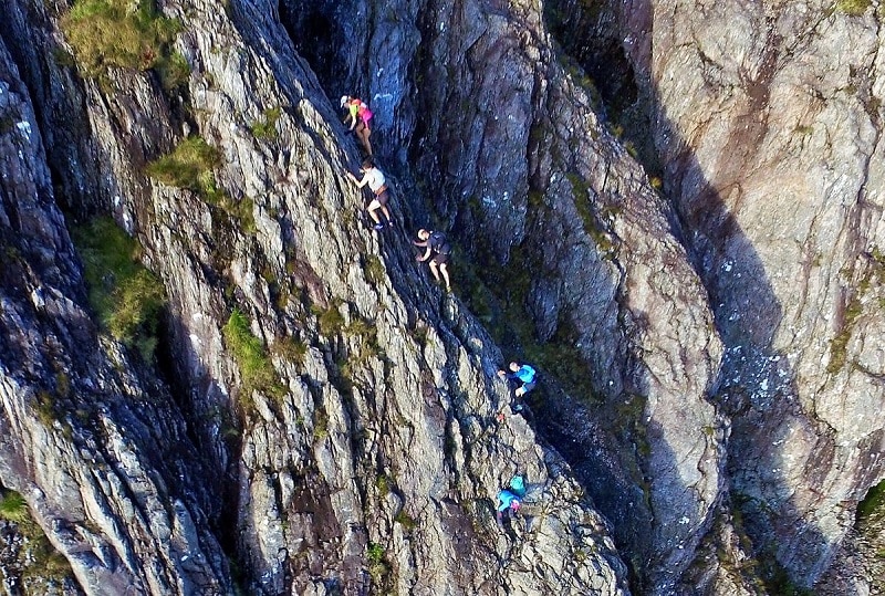 Los atletas han hecho la primera subida que les ha conducido a Altinafeadh, kilómetro 10 de carrera. A partir de este punto, Kilian Jornet y el resto de competidores han iniciado una de las partes más técnicas de la carrera, el ascenso a Stob Dearg por una vía de grado III conocida como Curved Ridge. Durante este primer tramo de carrera, Kilian era el cuarto integrante de la cabeza de carrera junto con Jonathan Albon, Alexis Sévennec y Bhim Bahadur Gurung. El atleta catalán no ha forzado y ha ido ritmo del grupo por un terreno donde él se siente muy cómodo debido a la similitud al entorno noruego donde entrena a diario.