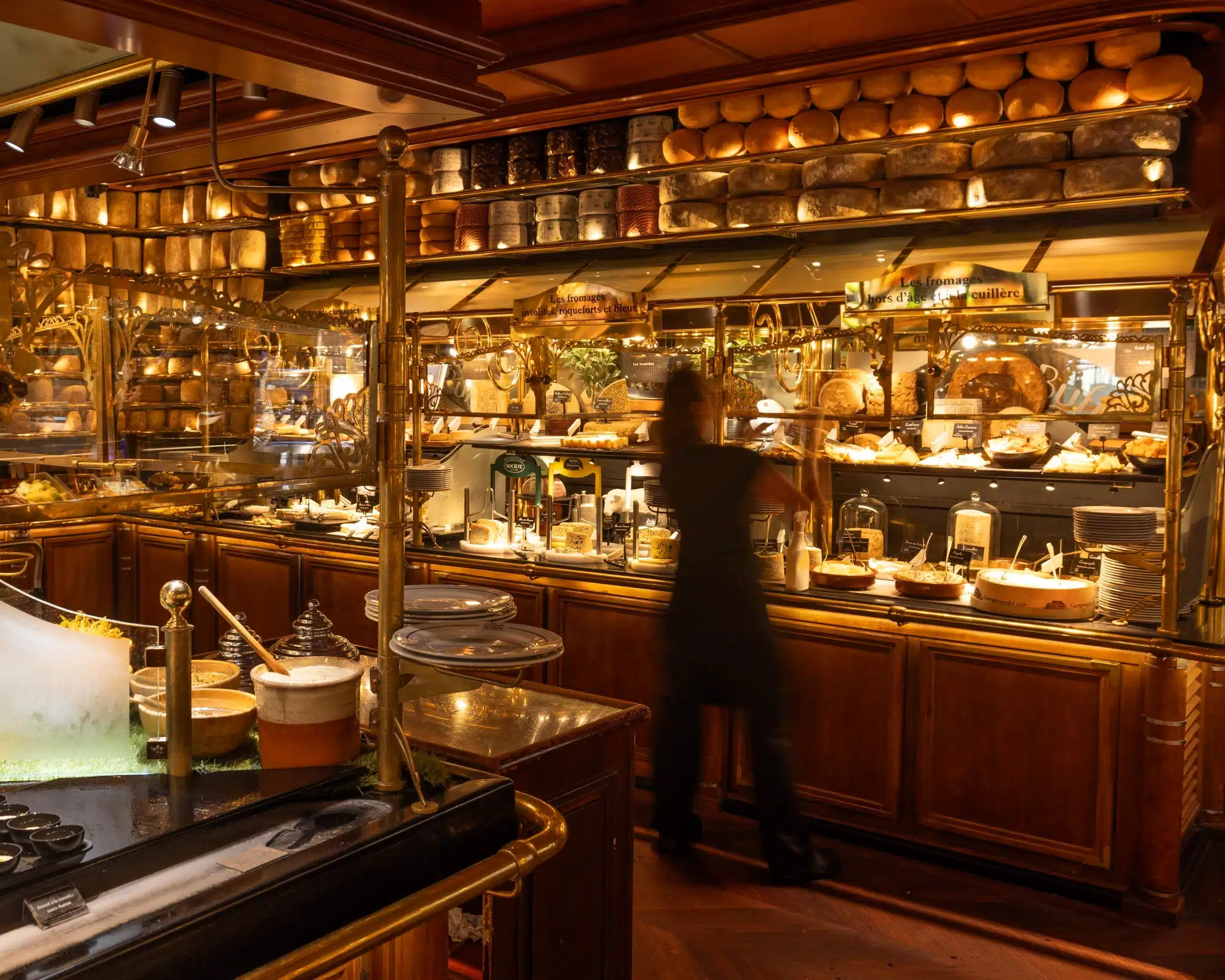 En Les Grands Buffets los amantes de las delicias heladas encontrarán su particular universo en L’Espace Glacier, decorado con espejos dorados, mármol, frescos, molduras y espléndidas vitrinas que evocan la atmósfera de las mansiones parisinas. Especialidades caseras como Pêche Melba, Poire Belle Hélène, Coupe Mont Blanc o los profiteroles al chocolate, acompañados por un Chantilly casero, ponen casi el punto final al festín gastronómico.