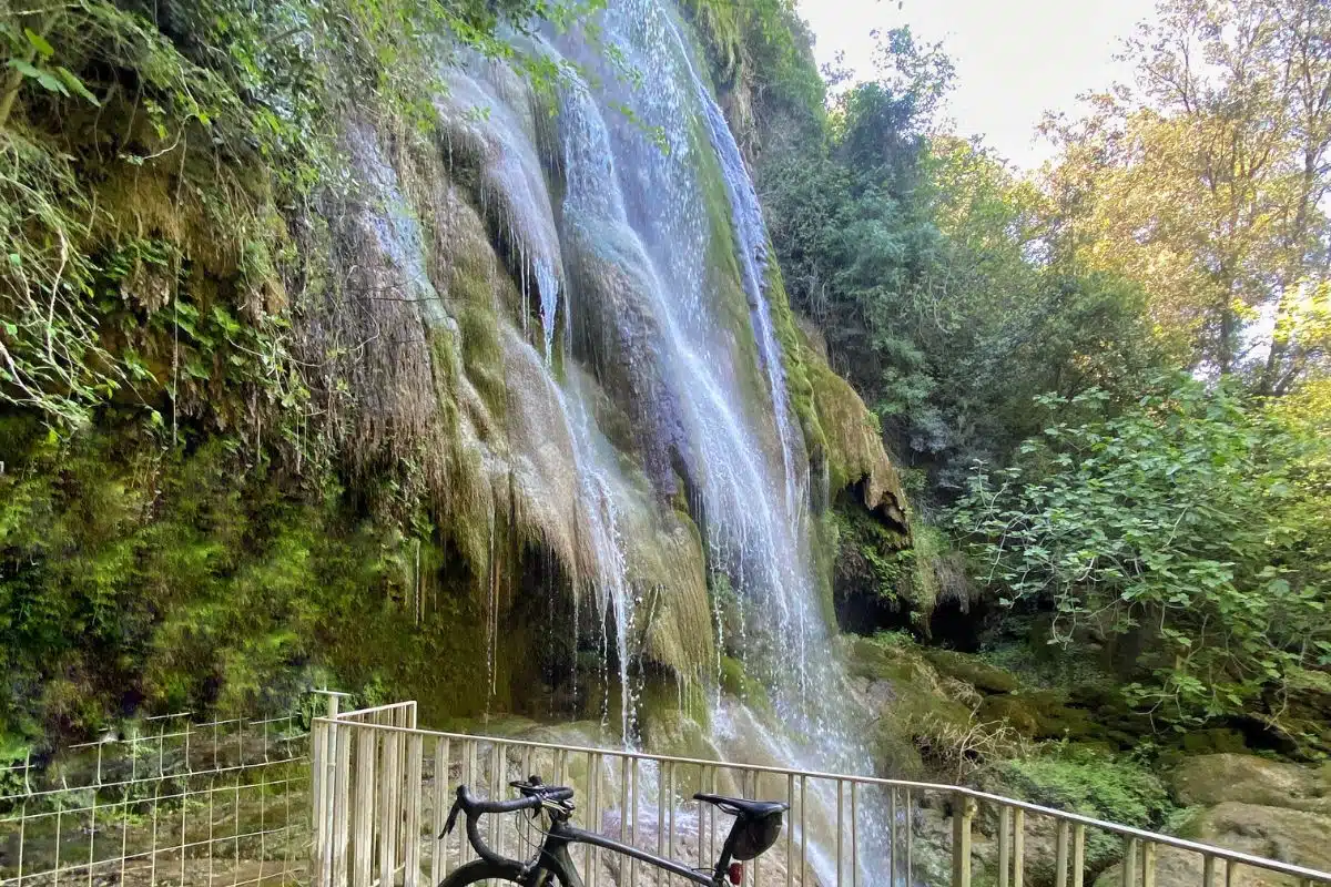 Desde aquí, la ruta nos lleva hasta lo alto del Puig Neulós (1.239 m), un coloso pirenaico clasificado como Hors Catégorie, y más tarde hasta el histórico Coll de la Manrella (715m), símbolo del exilio republicano. Dos subidas, una misma exigencia: pedaleo constante, sin tregua, sin descansos. Pero también con grandes recompensas: panorámicas inolvidables, historia viva al borde del camino y un salto de agua escondido para cerrar la jornada con un baño de frescor.
