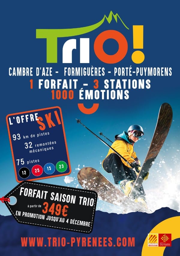El forfait ‘Trio Pyrénées’ es la unión comercial de Porté Pimorent, Cambra d’Aze y Formiguera y permite esquiar indistintamente en cualquiera de las tres estaciones del Pirineo francés.