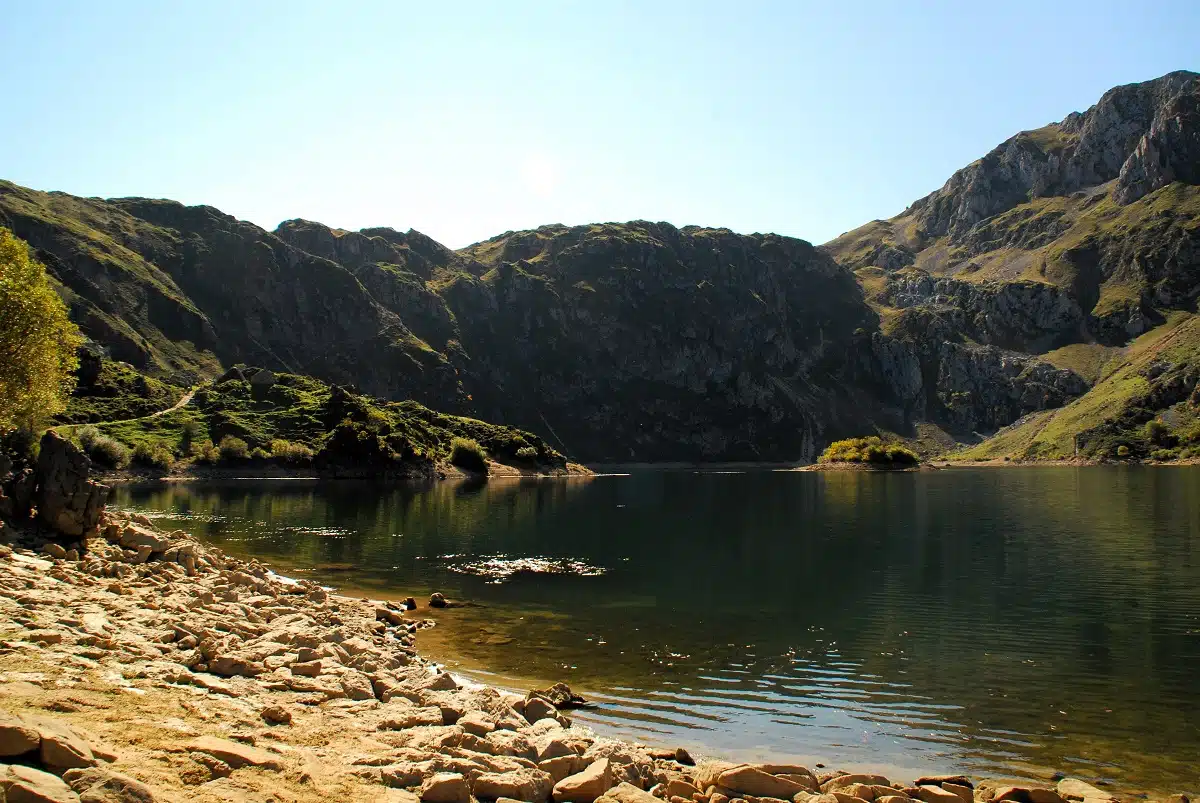 Después de aproximadamente media hora, caminando siempre en la misma dirección, llegarás a la Llomba de Camayor, desde donde podrás apreciar las crestas de Peña Llana, Cebolléu y Picos Albos. En este punto, el camino gira a la izquierda y continúa descendiendo hasta que en poco tiempo se divisa el Lago del Valle y las praderas que llevan al pueblo de Valle del Lago. Es necesario descender hasta la orilla del Lago del Valle. Aquí debes tener cuidado porque la bajada es bastante empinada y la pista no es muy estable, ya que es poco transitada.