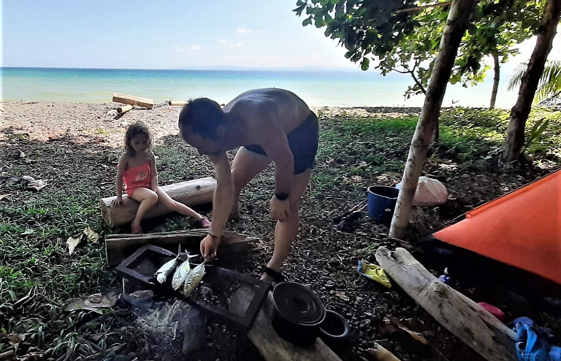 Desde hace una semana viven en una playa desierta situada en una península de la amplia área de Golfito, al sur de Costa Rica. Este paradisiaco lugar sólo es accesible con embarcación. La familia, que duerme en una tienda de campaña, debe ser autosuficiente y buscarse parte de la alimentación fresca de cada día con la pesca. El agua la consiguen en la misma playa. Cuando baja la marea de una forma natural brota de la tierra. Inicialmente tienen previsto estos confinados tres semanas en este paraje idílico y solitario, pero la situación podría alargarse en función de la evolución de la pandemia del coronavirus en sudamericano. Sólo el móvil los mantiene conectados con el mundo.