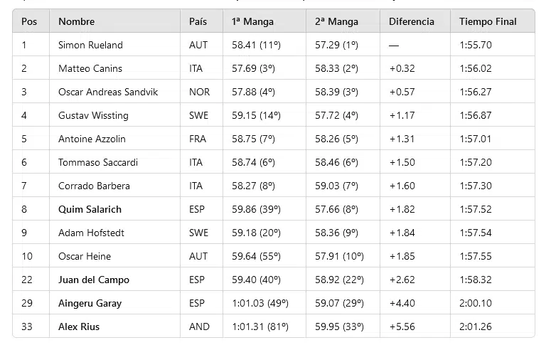 Mientras Salarich protagonizaba su remontada, en la parte alta de la clasificación la lucha por el podio estaba al rojo vivo. El noruego Peder Lunder, líder tras la primera manga, salía con la presión de mantener su ventaja. Sin embargo, en un giro comprometido, cometió un error que le llevó a salirse del trazado, quedando fuera de la competición. Esa situación dejó la puerta abierta para que el austríaco Simon Rueland aprovechara su oportunidad. Con una bajada agresiva y sin fallos, marcó el mejor tiempo de la segunda manga y se adjudicó la primera victoria de su carrera en la Copa de Europa, con un tiempo total de 1:55.70. El italiano Matteo Canins, que había sido segundo en la primera bajada, intentó responder, pero no pudo mejorar su crono y se tuvo que conformar con la plata (+0.32). Por su parte, el noruego Oscar Andreas Sandvik defendió su tercera plaza, cerrando el podio a +0.57 del ganador.