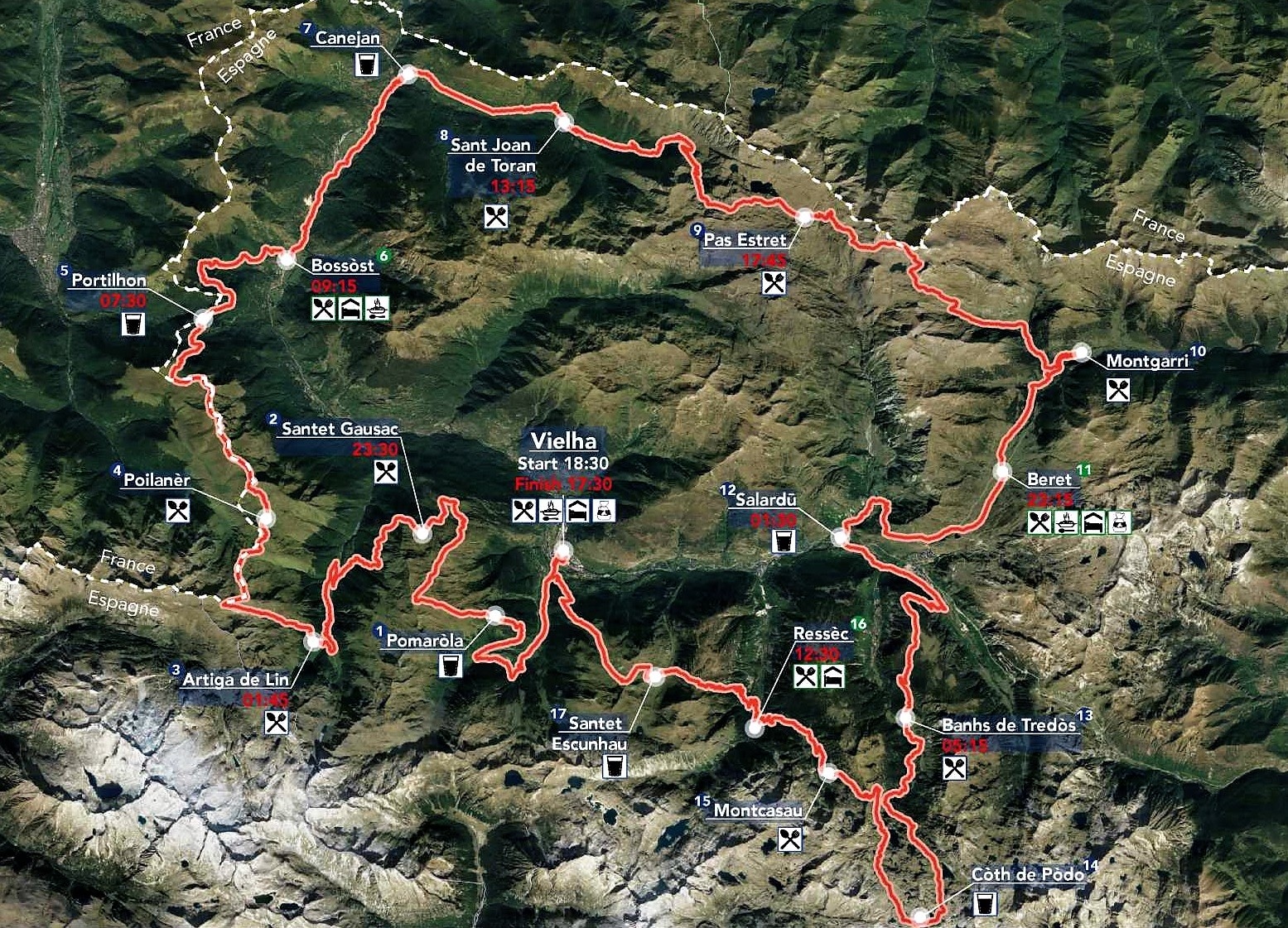 Es el recorrido equivalente a la UTMB Mont Blanc. Da la vuelta circular a todo el Valle de Aran, con salida y llegada en su capital, Viella.Todos los finishers obtendrán las Running Stones necesarias para acceder a la UTMB, CCC, TDS o OCC.