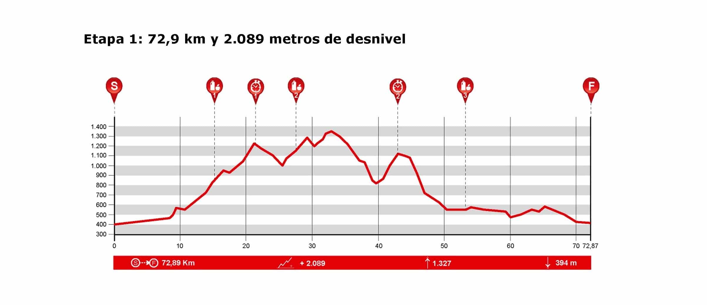Rioja Bike La etapa inaugural es similar a la de la pasada edición pero con más senderos. Ascenso prolongado por pista atravesando las típicas colinas de viñedos y la localidad de Clavijo (Km 15), antes de afrontar las primeras fuertes pendientes que servirán para desgranar el enorme