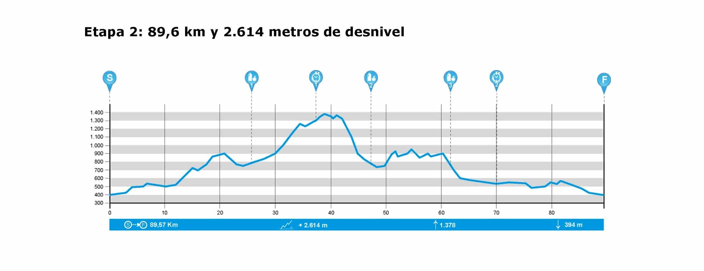 pelotón.Tras descender por un camino abrupto, se inicia la segunda parte de la ascensión principal por un magnífico sendero pasando por el pequeño pueblo de Luezas, y alcanzar la cima (Km 29) también por sendero en vez del camino del año pasado.