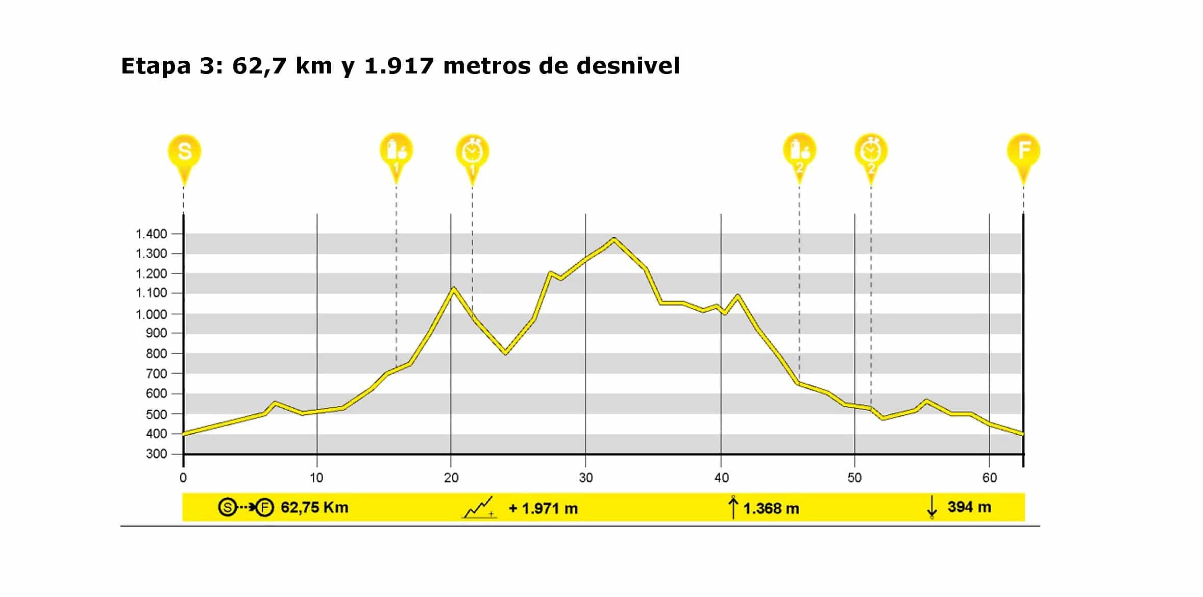 Rioja Bike La etapa reina y más novedosa. Por primera ocasión se rueda por cara oeste de la sierra de Moncalvillo. Se comienza rodando por pistas fáciles y ganando altitud hasta Santa Coloma (Km 26). En el embalse de Yalde se inicia una gran ascensión por un precioso hayedo con multitud de curvas en herradura. Tras llegar a la cima (Km 34) se crestea atravesando praderas y con unas vistas espectaculares, hasta comenzar el descenso del Plandero (Km 41) que finaliza en la lo calidad de Torrecilla de Cameros (Km 47). Hasta aquí, toda la etapa es prácticamente nueva. A continuación se afronta la novedad de hacer el tramo de sendero de la Calzada Romana en sentido opuesto a como se ha hecho en pasadas ediciones, desembocando en la localidad de Viguera (Km 62). A partir de aquí, prácticamente no hay tramos técnicos, y el regreso a meta es casi idéntico al del día anterior, evitando el bucle final del Pico del Águila.