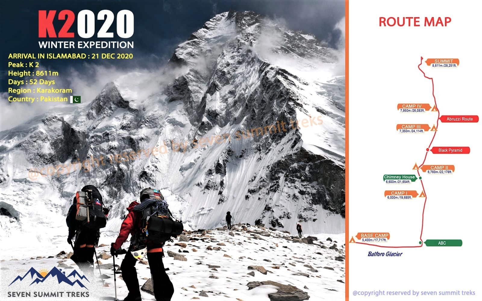 El 19 de diciembre Sergi Mingote partirá de Barcelona con destino a Islamabad (Pakistán) desde donde se volaran a Skardu. De aquí por pista y en 4X4 viajaran hasta el pueblo Skole. Desde este último punto comienza el trekking y tras una semana de caminata deberán llegar al campo base a 5.135 metros. Serán 52 días al limite de durísimo trabajo en equipo y condiciones extremas para equipar hasta el campo 4 situado a 8.000m y esperar el momento adecuado, si la meteorología y el viento lo permite, para el atacar la cumbre por la vía del Espolón de los Abruzzos.