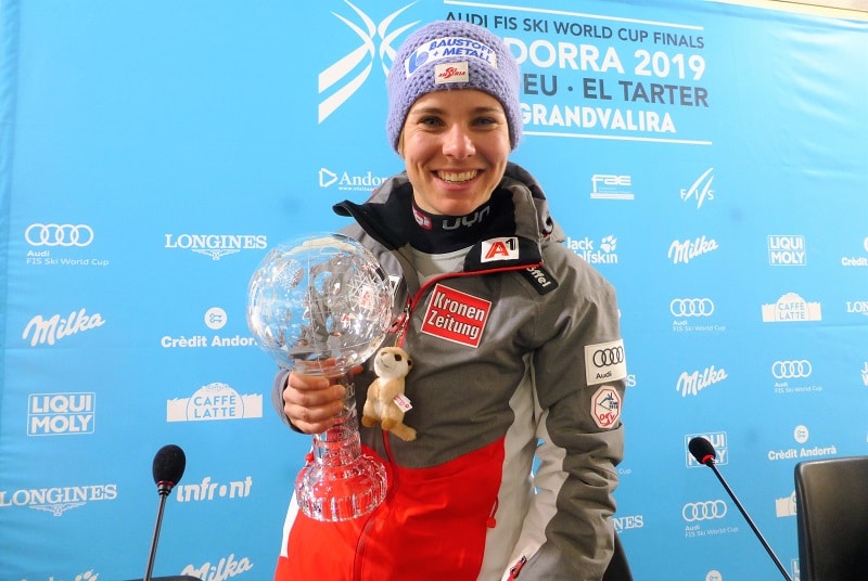 Nicole Schmidhofer con su Globo de Cristal de descenso de 2019.(Copyright/Turiski)