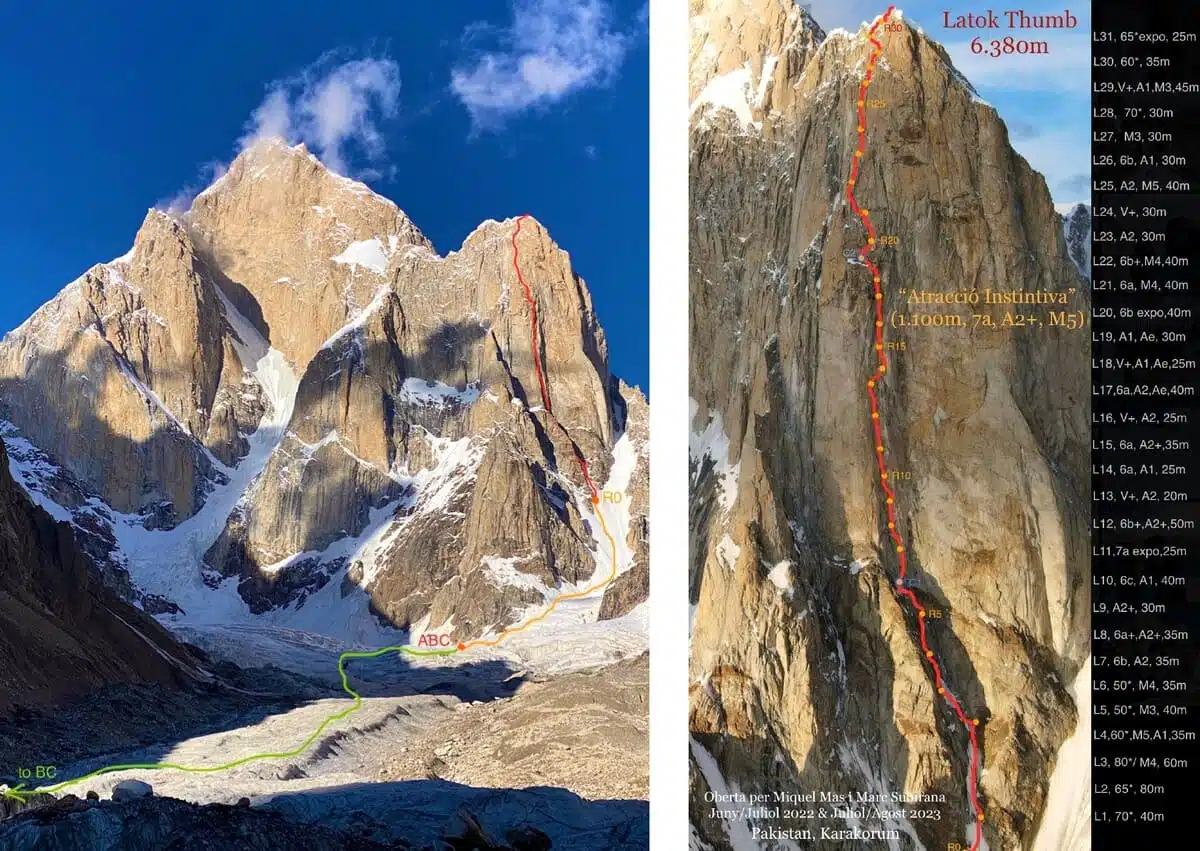 Miquel Mas y Marc Subirana explican como abrieron la nueva ruta al Latok Thumb a la que pusieron el nombre de «Atracción Instintiva (1100m, 7a expo, A2+, M5)». Por Miquel