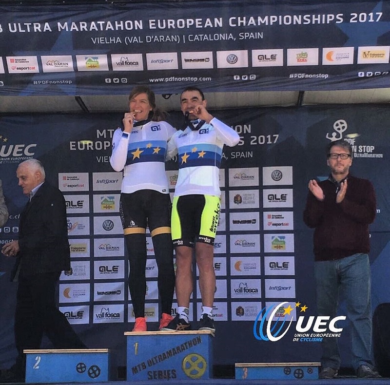 Joseba Albizu y Sandra Jordà se han enfundado el primer maillot de campeones de Europa de MTB, en la distancia Ultramaratón, que ha organizado la Union Européene de Cyclisme (UEC).