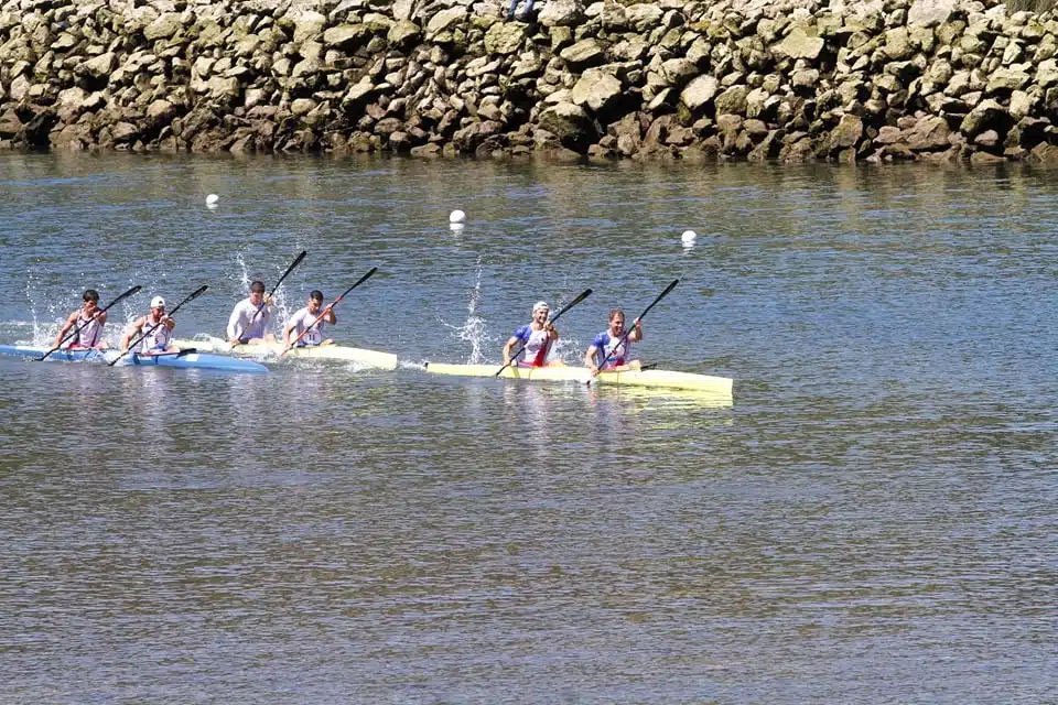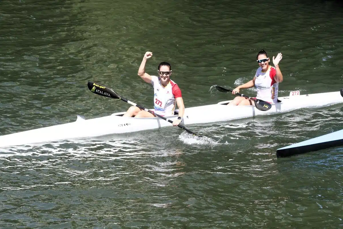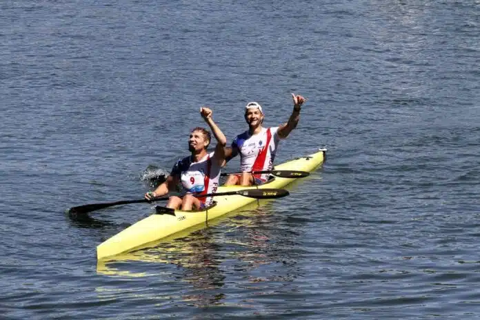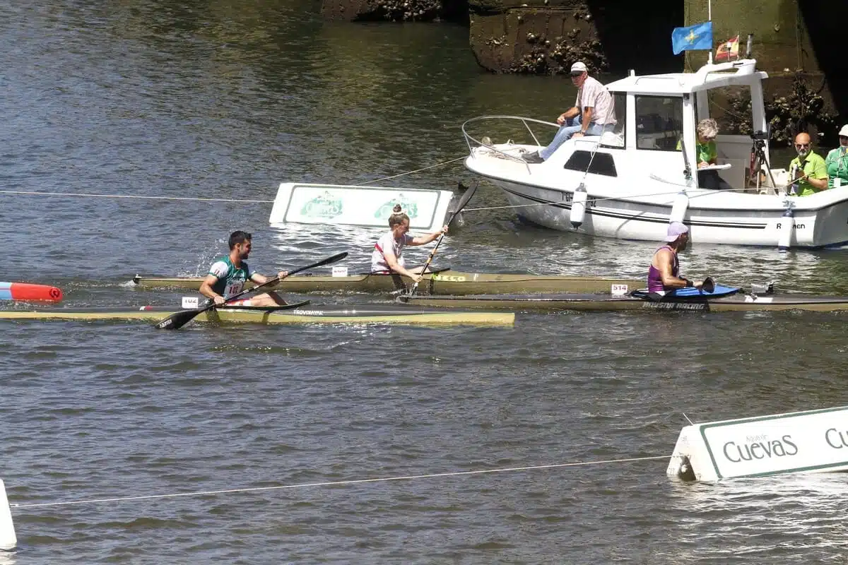 La prueba de piragüismo, que va entre las poblaciones de Arriondas y Ribadesella y tiene unos 20 km de descenso, estuvo marcada por el bajo caudal del río y la bajamar. La pareja francesa, actuales campeones de Europa de la especialidad de maratón, superaron en un apretado final a los húngaros Adrian Boros y Bruno Kolozsvari y a los asturianos Miguel Llorens y Alberto Plaza.