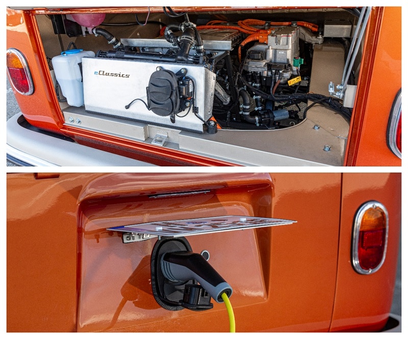AI igual que con el motor boxer del T1 de 1966, la combinación entre la caja de cambios con el motor eléctrico integrado en la parte trasera del e-Bulli impulsa el eje trasero. El suministro de energía del motor eléctrico viene de una batería de iones de litio, con una capacidad de energía utilizable de 45 kWh y el fabricante anuncia “una autonomía de alrededor de 200 kilómetros”. La toma se halla en la parte trasera, tras la placa de la matrícula. La batería se carga mediante un enchufe de sistema de carga combinada (CCS), que permite conectar el vehículo con corriente alterna o continua. La batería de alta tensión también puede cargarse en puntos de carga rápida de hasta 50 kW de potencia. En este caso, se llega al 80% en 40 minutos.