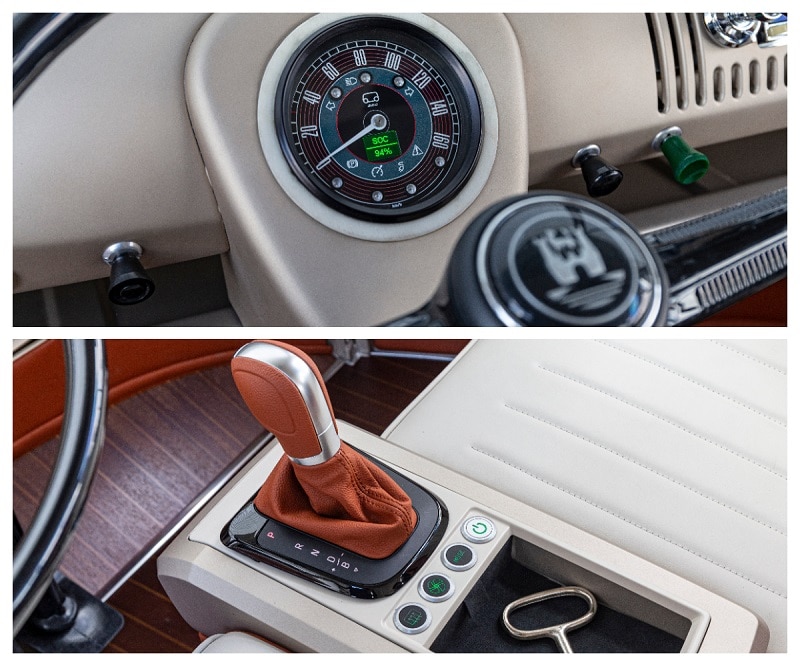 El diseño interior mantiene algún guiño al modelo original, como el volante e instrumentación, pero el resto fue repensado y puesto al día tecnológicamente. La moderna palanca de cambios de la transmisión automática está situada entre el conductor y el asiento del acompañante. El boton start/stop del motor eléctrico también está integrado en la consola. El velocímetro es el original, pero incorpora una pequeña pantalla digital de dos dígitos, que facilita diversa información al conductor, incluyendo la autonomía de la batería. Unos leds también indican, por ejemplo, si el freno de mano esta activado o si el cable de carga esta enchufada. Las informaciones pueden consultarse en la tablet integrada en la consola del techo.