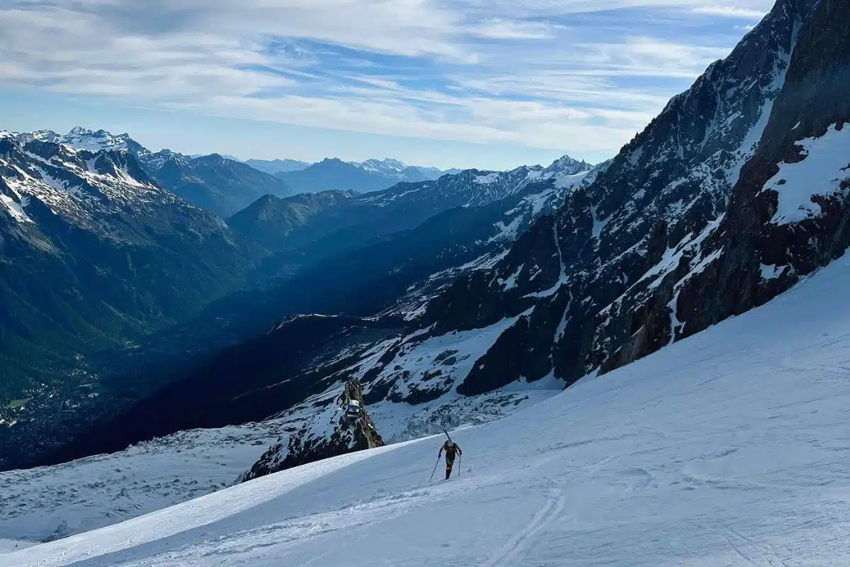 A las 9:30 ya pisaba la cima del Mont Blanc (4.810 m), culminando una ascensión casi quirúrgica, sin florituras, pero a ritmo demoledor. Y sin tiempo que perder, inició un descenso fulgurante con esquís, aprovechando la buena calidad de la nieve en las palas altas. En cuanto la nieve desapareció, tocó nuevamente correr. Entró en el centro de Chamonix a las 10:30 en punto, para cerrar una jornada de vértigo.